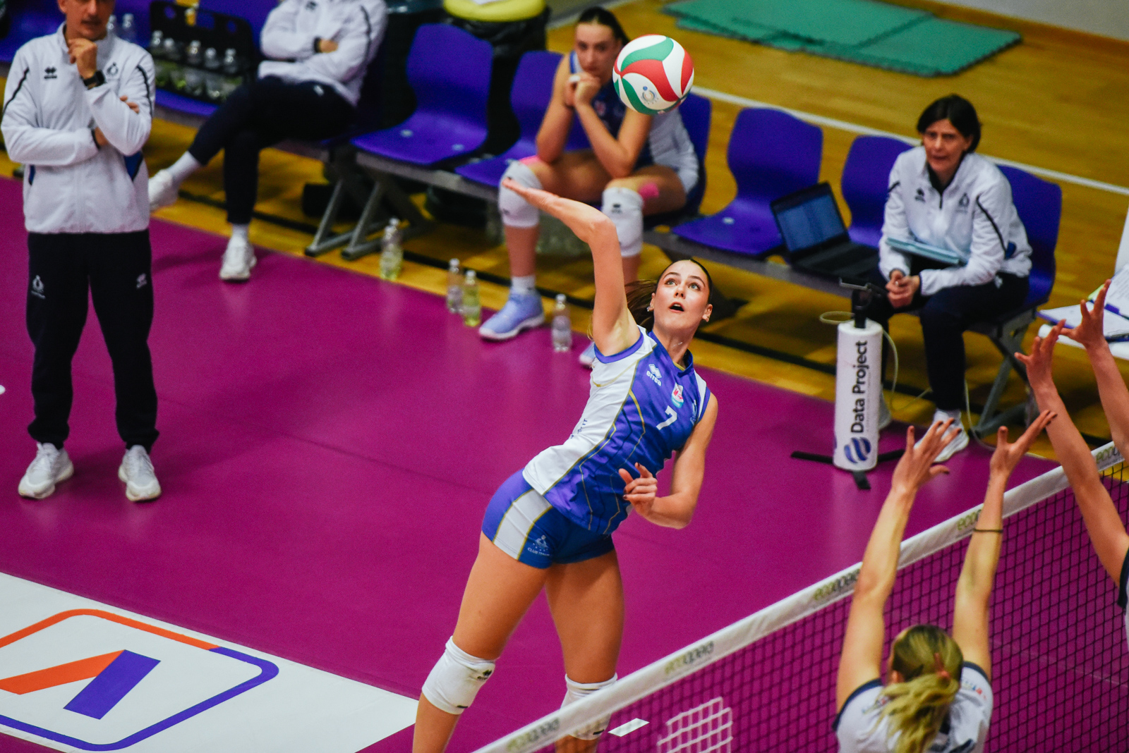 Il primo punto del match è un muro di Caruso che inaugura un set iniziale equilibrato e giocato punto a punto. Si procede così fino ai due colpi di Alice Pamio e Dominika Giuliani che danno un primo slancio a Trento. Le padrone di casa allungano sul 10-7 grazie a un primo tempo vincente di Marconato e il Club Italia prova a rimanere agganciato. Sul 14-11 coach Cichello ricorre al doppio cambio: fuori Spaziano e Caruso, dentro Magnabosco e Solovei. Un attacco e un muro di Caterina Peroni riportano la parità sul 15-15. Da qui, però, Trento ingrana una marcia in più: muro di Lazda (18-15), poi gli attacchi vincenti di Giuliani (21-17) e Pamio (23-19). È ancora Lazda a chiudere 25-20, fissando l’1-0.