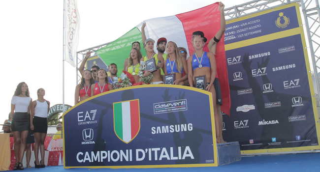Le due finali per il primo posto, trasmesse in diretta televisiva da FOX Sports, sono arrivate a conclusione di un’intensissima tre giorni di gare, per un totale di 118 incontri disputati, seguiti da un pubblico appassionato e numeroso (quasi 1000 spettatori per i match decisivi) accompagnato anche dall’animazione di Cubanima. La cerimonia di premiazione, alla quale sono intervenuti anche il vicepresidente della Federazione Italiana Pallavolo, Adriano Bilato, il segretario generale, Alberto Rabiti, e i consiglieri federali Davide Anzalone e Franco Bertoli, ha concluso degnamente un Campionato Italiano che quest’anno ha vissuto una stagione di grande rilancio, grazie all’impegno di staff organizzativo e promoter locali, atleti, direttori di gara, staff tecnico arbitrale e naturalmente alla collaborazione dei partner e degli sponsor che hanno seguito da vicino la manifestazione: EA7 Emporio Armani, Samsung, Honda, Mikasa e Clas Eventi.