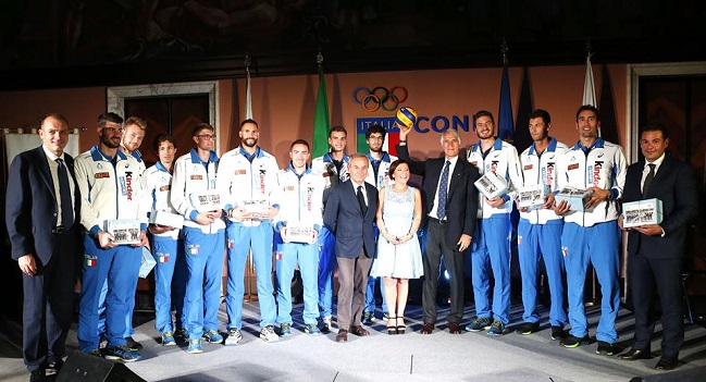 Gran finale con la nazionale schierata sul palco al completo per ricevere un riconoscimento e la successiva consegna al presidente Malagò di un pallone firmato da tutti i giganti dell’Italvolley.