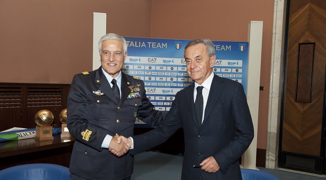 Nella splendida cornice del Salone d'Onore del Coni, nell'ambito della presentazione del 70esimo Campionato Italiano di Pallavolo Maschile di Serie A Unipol Sai, è stato firmato il protocollo d’Intesa tra la Federazione Italiana Pallavolo e l’Aeronautica Militare. Ad apporre la firma sul protocollo, che rinnoverà per il prossimo quadriennio la collaborazione già esistente dal 2009, sono stati il Presidente Federale Carlo Magri ed il Generale di Brigata Aerea Claudio Salerno, Capo Ufficio Generale per la Comunicazione e Presidente del Centro Sportivo dell’Aeronautica Militare. La collaborazione tra la FIPAV e l’AM, dunque, continua con il Club Italia Aeronautica Militare che parteciperà al Campionato di serie B2 e che come di consueto lavorerà presso le strutture del Centro Sportivo di Vigna di Valle. All’evento ha presenziato il Capo di Stato Maggiore dell’Aeronautica Militare, il Generale di Squadra Aerea Pasquale Preziosa, che ha rivolto un messaggio ai giovani atleti che comporranno il “Club Italia Aeronautica Militare”. Non poteva mancare l’intervento del padrone di casa, il Presidente del CONI, Giovanni Malagò, che ha dato merito all’Aeronautica di aver iniziato un nuovo progetto di collaborazione teso a dare un importante supporto alla crescita dei giovani talenti, mettendo in sinergia le proprie competenze con quelle della Federazione.
